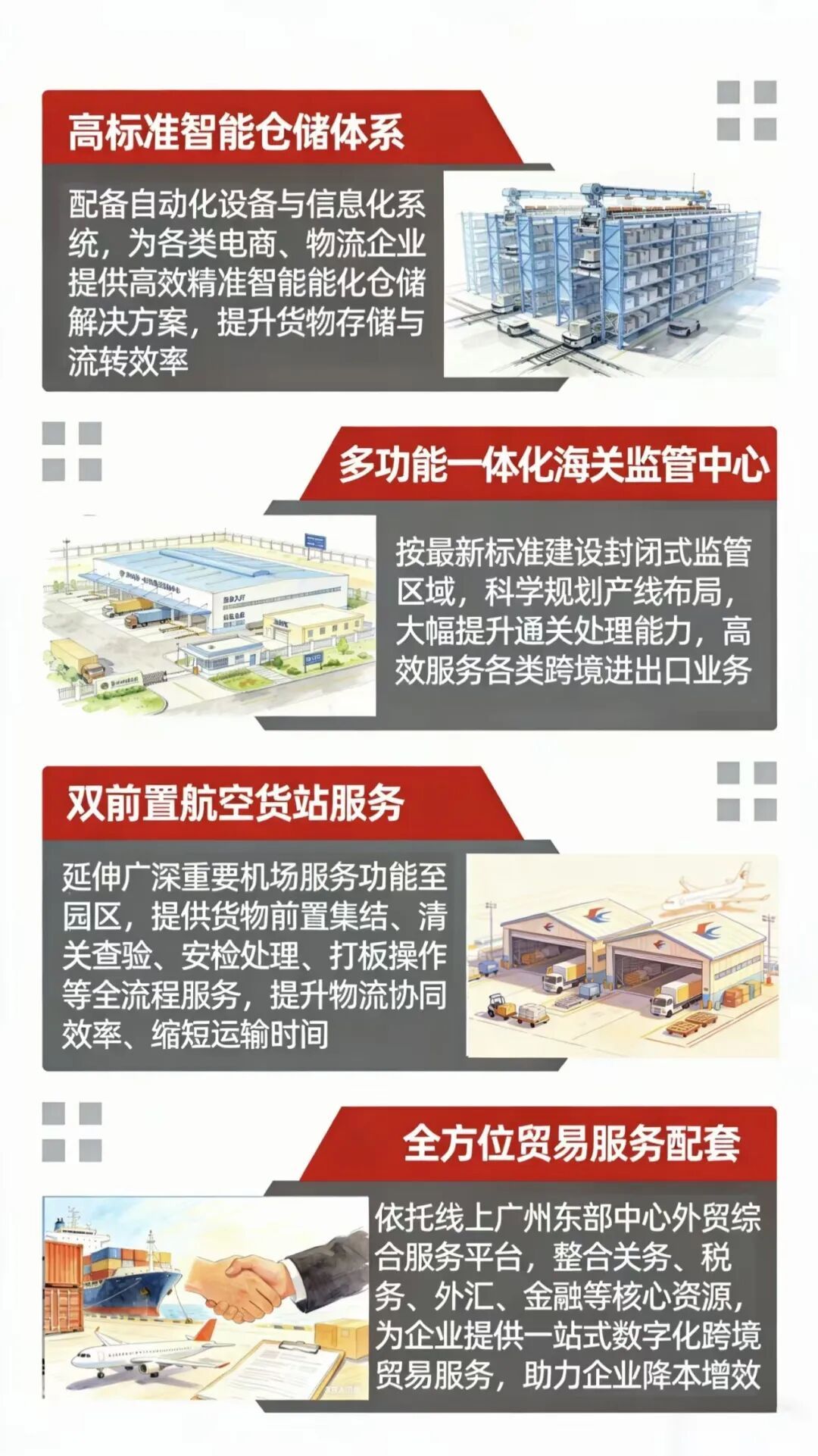 项目定位项目立足增城、面向大湾区,定位为区域首个具有海关监管功能的一站式跨境电商综合产业园区,将打造四大核心功能体系,构建全方位、全链条的跨境电商+外贸综合服务生态圈。