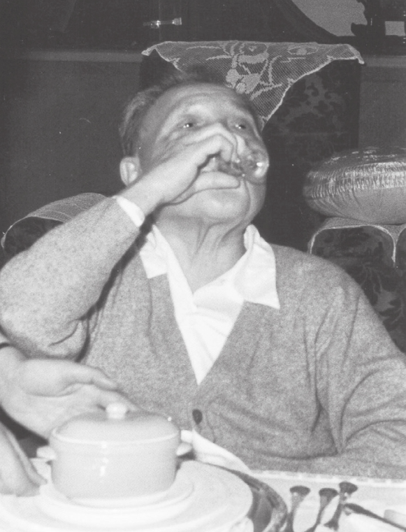 午餐安排在12点,和家人一起用餐,一大家有十三四人分坐两桌。午餐通常是四菜一汤,其中两荤两素;另有一杯白酒或黄酒;他爱吃辣椒。午饭后,他一般稍作休息。下午有时约牌友打桥牌。
